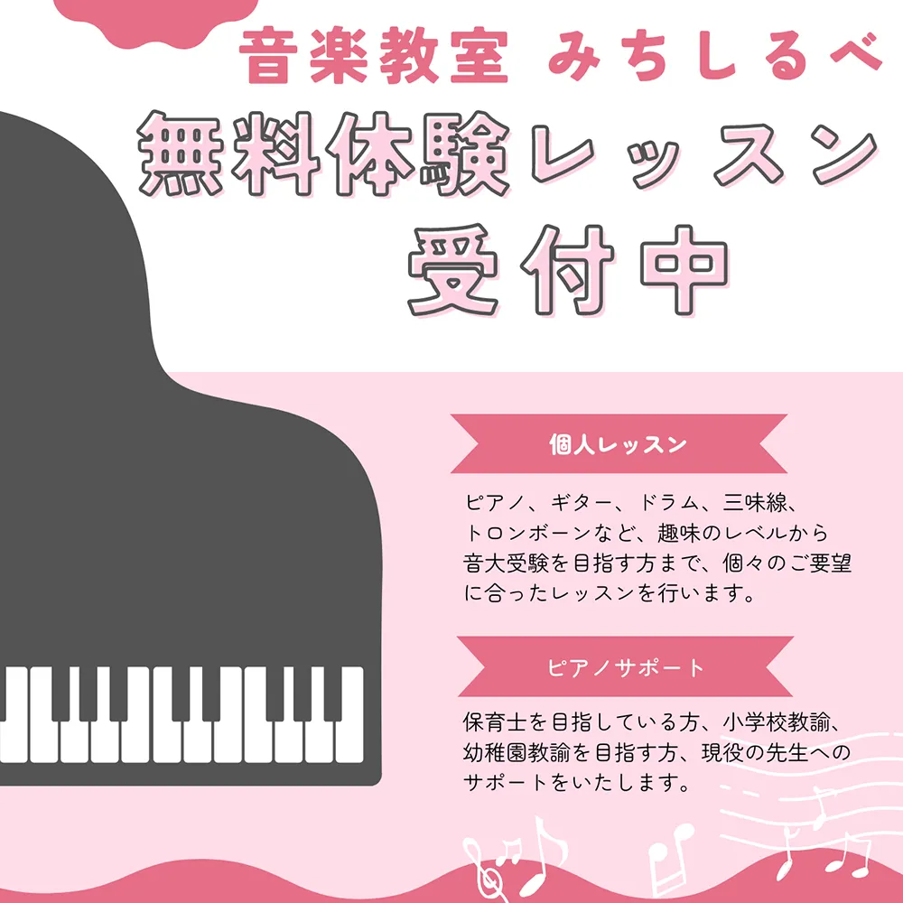※レッスンで使用するドラムは大人用のため、生徒さんの体格によってはドラム”セット”ではなく一部を使用したレッスンとなる場合があります。体験レッスンの際にご相談させていただきます。
